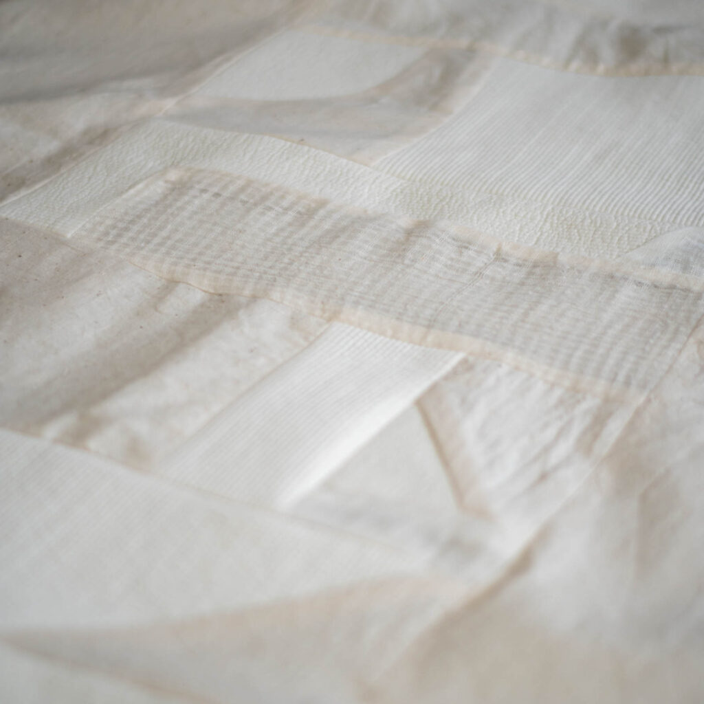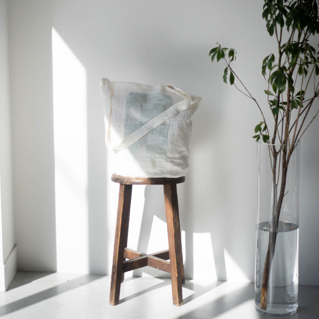素材が持つさまざまな表情を大切にしながら、自身の感覚に導かれるままに布を組み合わせていきます。同じものがひとつとしてない作品は、静かな佇まいのなかに豊かな空気を宿します。